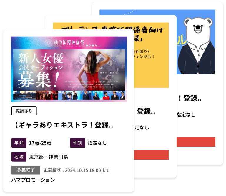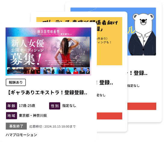 様々な映画やドラマの案件だけでなく、スケジュールが不規則な役者さん向けのアルバイト情報等も随時発信しています。